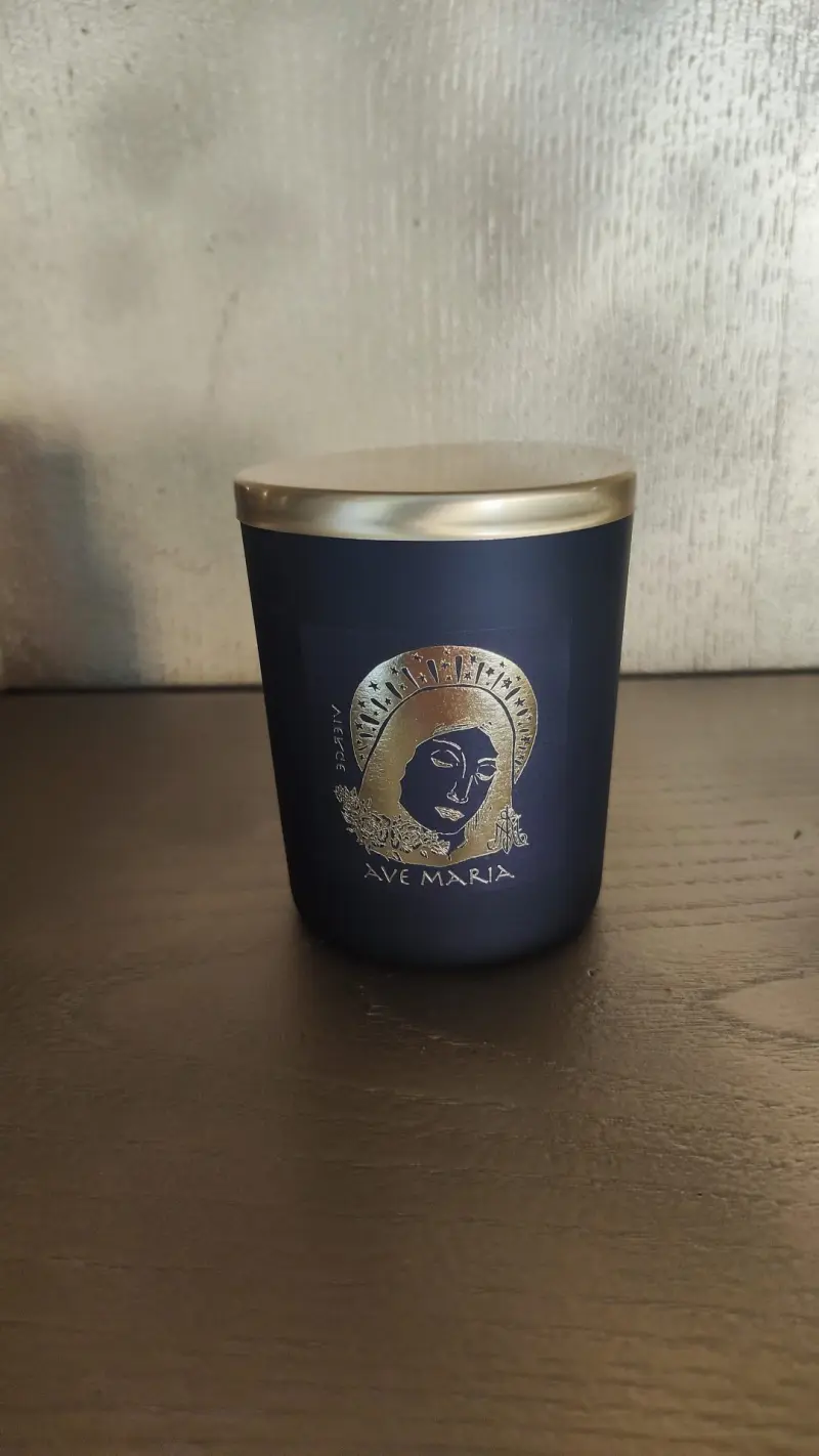 Notre Bougie parfumée 180g Motif Ave Maria de la collection Cabinet de Curiosités.
